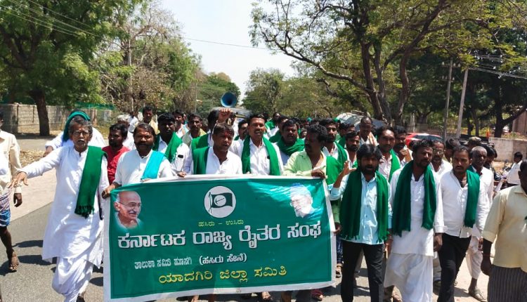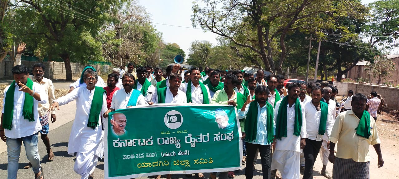 ಕರ್ನಾಟಕ ರಾಜ್ಯ ರೈತ ಸಂಘ ಹಸಿರು ಸೇನೆ, ನಾರಾಯಣಪುರ ಡ್ಯಾಂ ಮೂಲಕ ಎಡದಂಡೆ ಕಾಲುವೆ ರೈತರ ಜಮೀನುಗಳಿಗೆ ದಿನಾಂಕ 15.04.2021ವರೆಗೆ ನೀರನ್ನು ಹರಿಸುವಂತೆ ಆಗ್ರಹಿಸಿ ನಾರಾಯಣಪುರದ ವಾಲ್ಮೀಕಿ ವೃತ್ತದಿಂದ ಮುಖ್ಯ ಅಭಿಯಂತರರು ಕೆಬಿಜೆಎನ್ಎಲ್ ಕಚೇರಿಯವರೆಗೆ ಪ್ರತಿಭಟನಾ ಮೆರವಣಿಗೆ ನಡೆಸಿದರು.