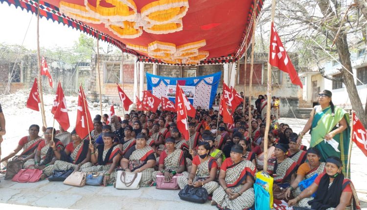 ಕರ್ನಾಟಕ ರಾಜ್ಯ ಅಂಗನವಾಡಿ ನೌಕರರ ಸಂಘ , ತಾಲ್ಲೂಕು ಸಮಿತಿ ಸಿಐಟಿಯು ಸಂಯೋಗದಲ್ಲಿ ಧರಣಿ ಕುಳಿತ ಕಾರ್ಯಕರ್ತೆಯರು,